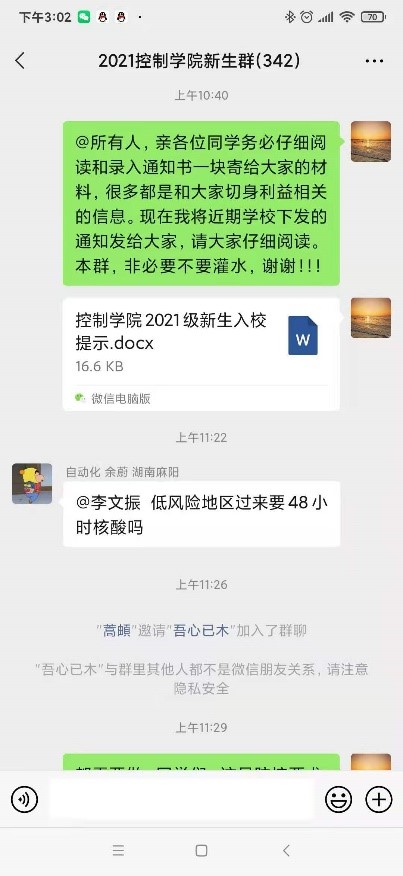 经过大家的努力,成功了建立了学院2021级新生群,及时给全体新生发送学校相关的信息及通知,更是落实全心全意服务员工宗旨的具体体现。