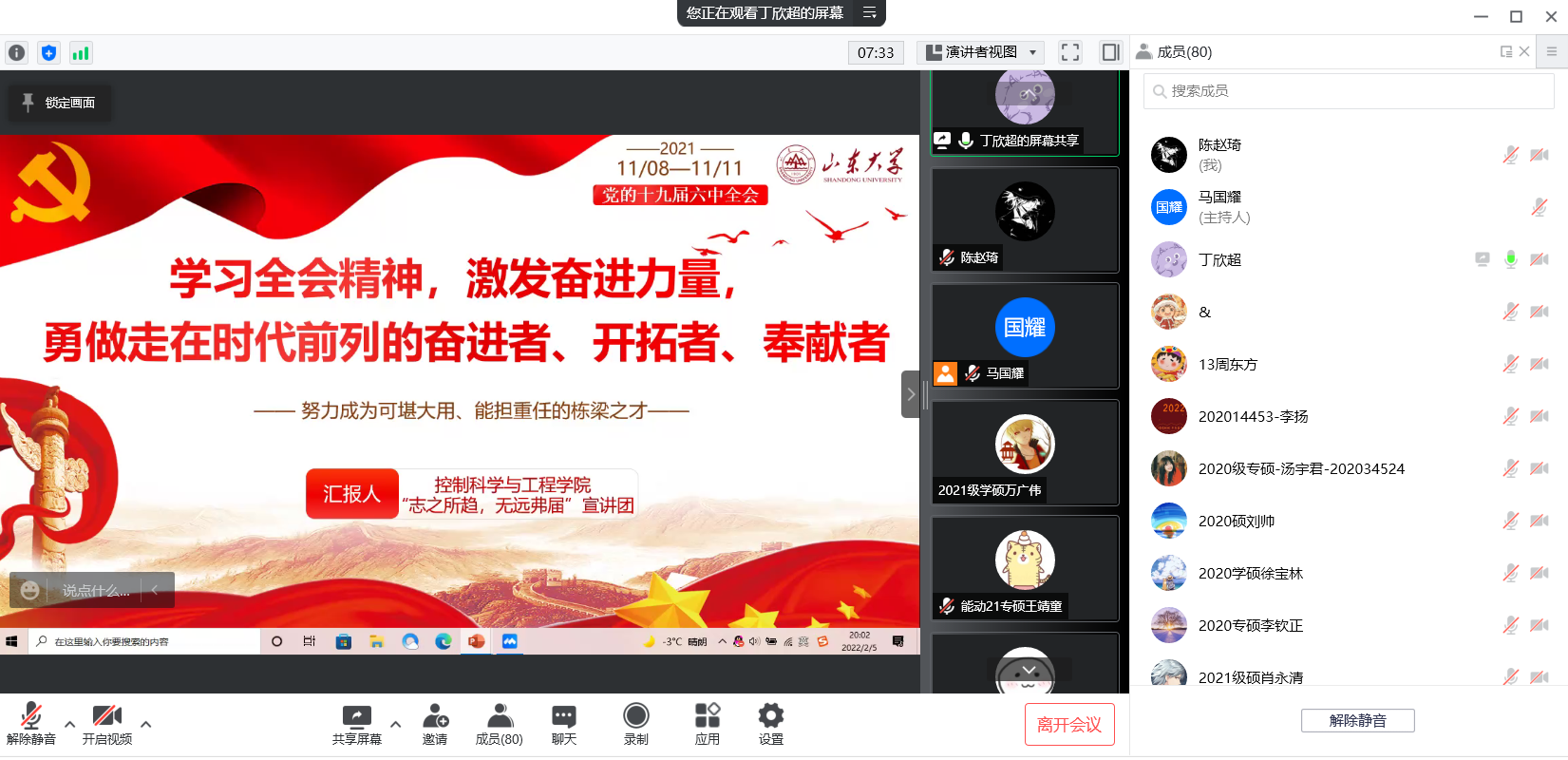 为深入学习宣传贯彻党的十九届六中全会精神,引导广大青年员工坚定政治立场、坚守理想信念,近日,伟德国际bevictor1946 “志之所趋,无远弗届”宣讲团联合能源与动力工程学院 “能动天巧”宣讲队,面向伟德国际bevictor1946、能动学院研究生,举行了一次线上党的十九届六中全会精神宣讲会,会议由伟德国际bevictor1946研究生会主席马国耀主持。