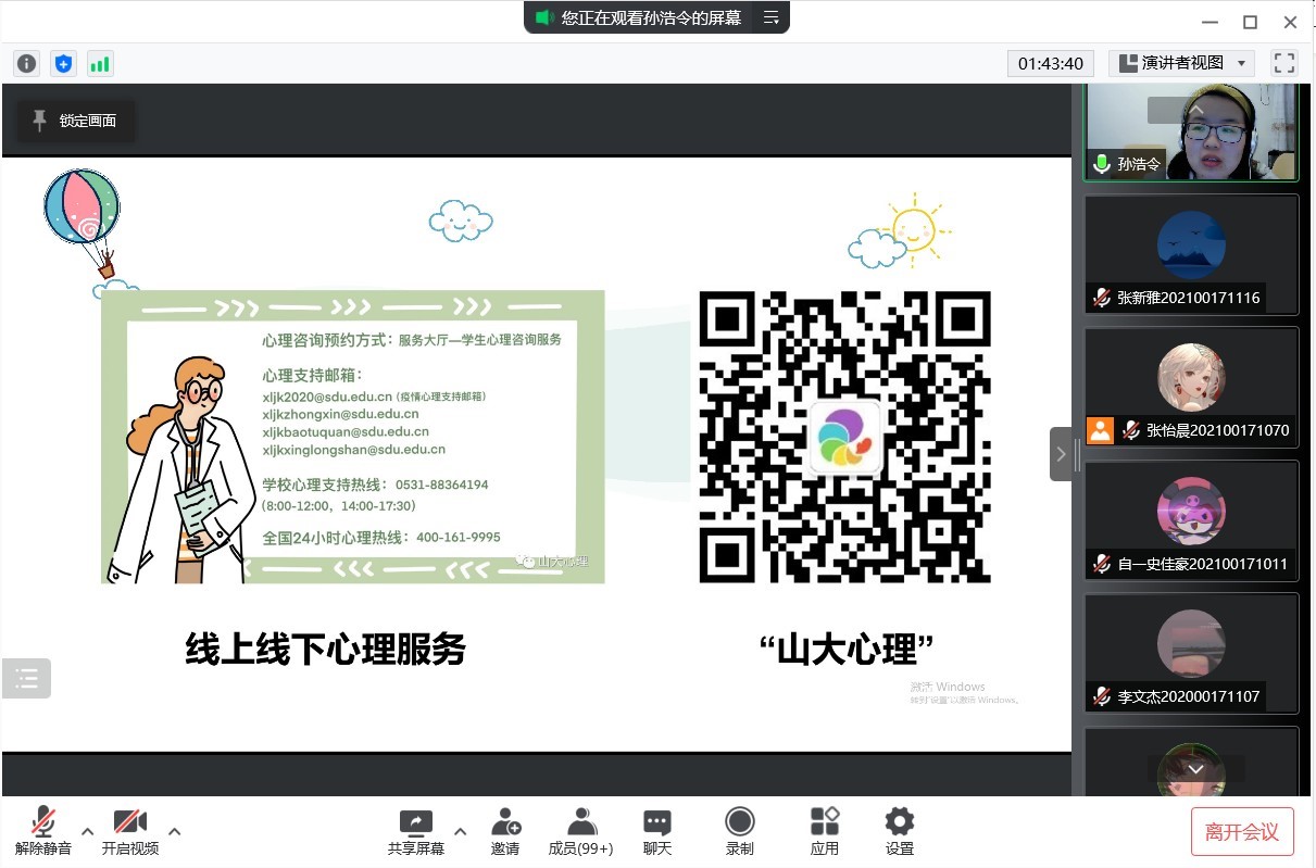 此次讲座有助于帮助同学们疏解情期间自己的压力,提升员工对疫情期间可能出现的心理问题的应对处理能力和对自我情绪的调控能力。学院始终心系员工,立足于员工的实际需求,积极组织开展“读书分享会”、“四点半课堂”体育系列活动、美育大讲堂、体育大讲堂等大众品牌活动,引导员工涵养健康向上的社会心态,用健康生活舒缓压力。在疫情防控关键时期,学院上下齐动员,同心共筑疫情防控“钢铁长城”,不断加强面对疫情的心理援助,为员工撑起心灵“保护伞”、穿好心灵“防护服”、织起心灵“防疫网”、戴好心灵“口罩”。
