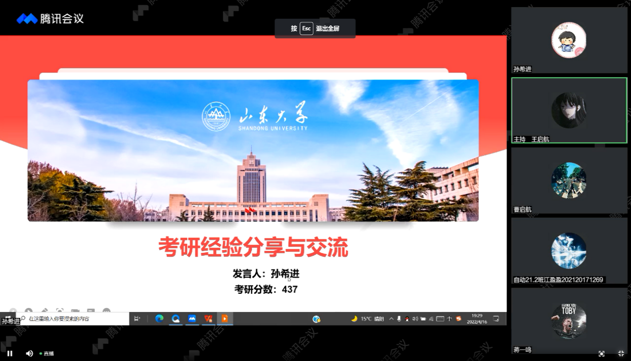 讲座期间,朱林一、刘威、赵天豪、仲世超、曹启航、孙希进、蒋一鸣同学从多个方面,详细地讲述了目前考研形势、最优择校方法、考研高分秘籍和备考技巧心得等,同时就备考期间心理调节、考试过程注意事项等细节,结合自身实际经历,全面且细致地分享了经验。考研优秀员工代表着重强调收集信息的重要意义:学会甄别有效信息,时刻关注考研院校官网,分析历年考研信息等。讲座最后,代表向同学们提出实用且中肯的建议,例如每天制定学习计划,劳逸结合、循序渐进,与研友相互督促,共同努力……这些经验与建议消除同学们关于考研的迷茫与疑惑,增强了同学们考研信心。