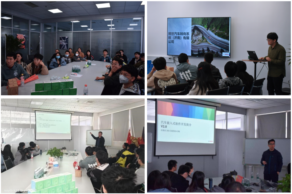 本次参观由企业课堂与实地参观两部分组成。企业课堂中,首先由系统资深专家吴嵩向同学们介绍博世集团的发展历史、主要业务板块、发展现状以及未来趋势。博世汽车转向系统(济南)有限公司是博世集团的全资子公司,是中国技术领先的高品质商用卡车及客车转向系统产品供应商,拥有独立研发中心及整车试车场,并在新产品研发及国内外市场拓展方面不断发展。之后,硬件专家贾凯和软件专家赵健业分别从硬件系统和软件系统方面与同学们介绍电子电气及汽车嵌入式开发有关知识和学习经验。他们建议同学们夯实专业基础,积极参与社会实践活动,在实践中进一步理解所学知识,锤炼自身本领。在讨论环节中,同学们积极提问,现场气氛热烈,同学们收获颇丰。