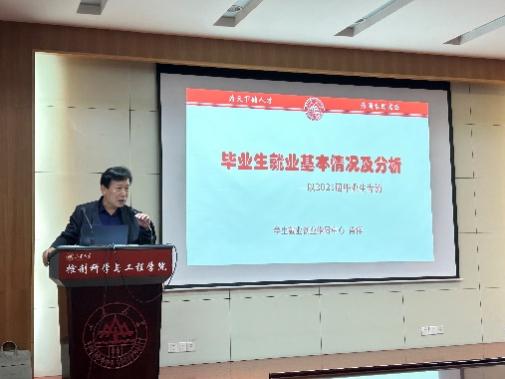 肖祥以学校2021届毕业生为例,向同学们详细介绍了毕业生就业的基本情况,围绕毕业生规模和结构、毕业生签约就业流向以及毕业生服务国家战略就业情况等方向进行了全面细致地讲解和指导。根据2021届和2022届研究生就业相关数据,肖祥详细展示了学院近两年毕业研究生的就业信息,为同学们的就业择业提供了最直接的一手资料,具有最直观形象的参考价值。最后,肖祥指出了研究生就业过程中存在的问题与优势,结合近两年就业情况和当前国内外经济发展趋势,提醒同学们,研判当前就业形势,树立合理就业择业观念,做好高质量充分就业准备。