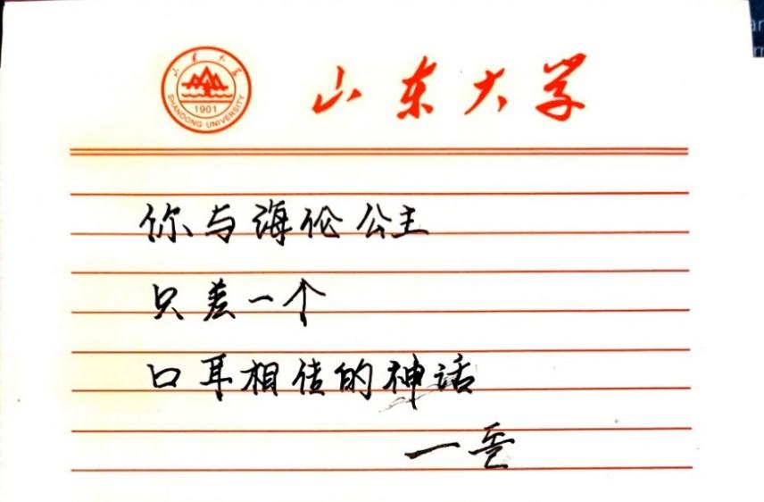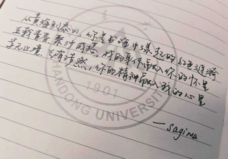 有人用热血的青春为国高歌:“灯火璀璨,空谷幽兰;你把它们刻进了岁月;我把你唱成了歌”;有人向山大献上炽热的表白:“从黄海到泰山,你是书海中漾起的红色涟漪;五载青春,聚沙成塔,我的身体融入你的怀里;学无止境,气有浩然,你的精神融入我的心里。”有人用柔情的话语对“Ta”倾诉心意:“你与海伦公主,只差一个,口耳相传的神话。”