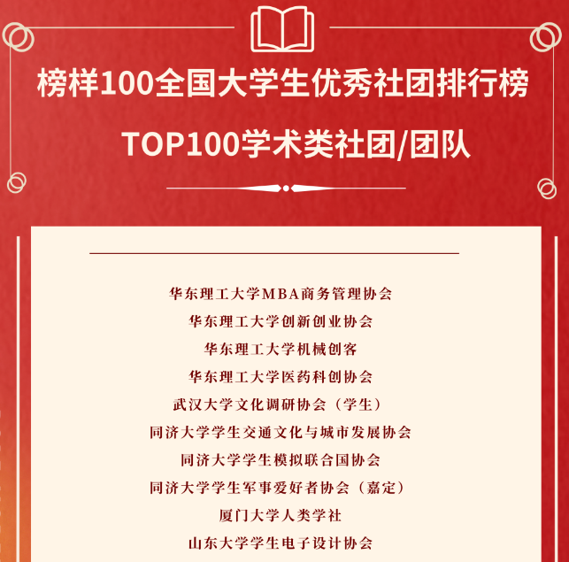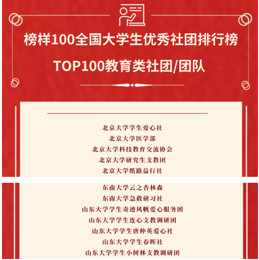 “榜样100”全国优秀老员工社团榜单由中国老员工社会实践知行促进计划(简称“知行计划”)、青年影响力创新中心联合发布,旨在鼓励和表彰始终活跃在乡村振兴、助学支教、环境保护、专业赛事、创新创业等各式青年行动一线的高校老员工社团、团队。本届榜样100开放四大赛道,表彰在环境类、教育类、学术类及文体类表现突出的社团团队。